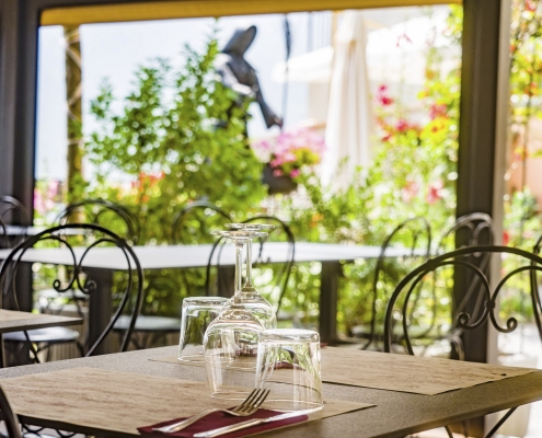 Nel periodo estivo la terrazza all’aperto con il dehor con splendida vista sulla valle.