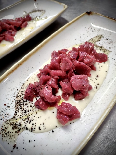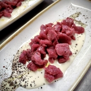 Dadolata di manzo cruda13,00Carne magra di manzo, tagliata al coltello, servita cruda su crema di parmigiano